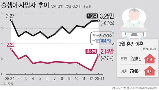올해 1월 출생아 수가 2만1442명으로 전년 대비 7.7% 줄며 15개월 연속 감소세다. 혼인 건수가 2020년 12월 이후 3년여 만에 처음으로 2만 건을 넘어섰지만 이혼 건수도 전년 대비 증가했다.