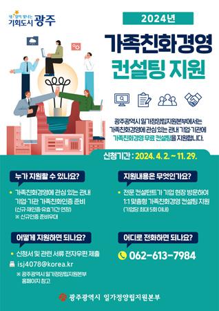 광주시일가정양립지원본부는 가족친화기업인증에 어려움이 있는 기업을 대상으로 \'가족친화경영 컨설팅\'을 지원한다고 1일 밝혔다.