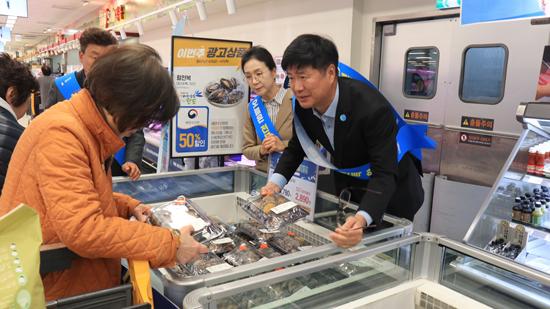 김현철 완도부군수와 ㈜행복한전복은 최근 이마트 용산점에서 판촉전을 갖고 전복 구매 고객에게 \'완도 순살전복\'을 증정하는 이벤트를 펼쳤다.