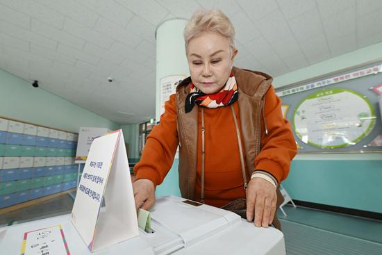 신조야 고려인마을 대표가 제22대 국회의원 선거일인 10일 오전 광주 광산구 우산동 제4투표소에서 투표하고 있다.