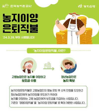고령 농업인이 소유한 농지를 공사에 매도 또는 매도를 조건으로 임대하는 경우 매월 일정 금액의 직불금을 지원하는 제도로 올해 126억원의 예산을 편성했다.