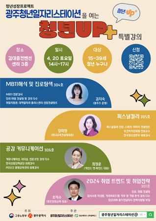 광주시는 구직에 어려움을 겪는 청년들이 취업 전략을 설계할 수 있도록 \'청년 업(UP)+\' 특강을 20일 오후 2시 김대중컨벤션센터에서 진행한다고 17일 밝혔다.