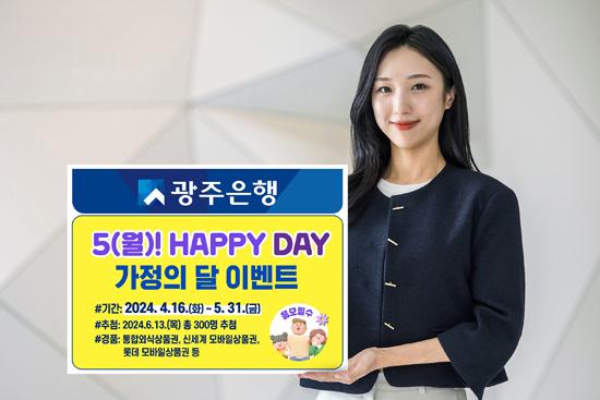 광주은행은 오는 5월 31일까지 KJ카드 개인고객 300명을 추첨해 다양한 상품권을 증정하는 \'5월! 해피데이 가정의달 이벤트\'를 진행한다고 17일 밝혔다.