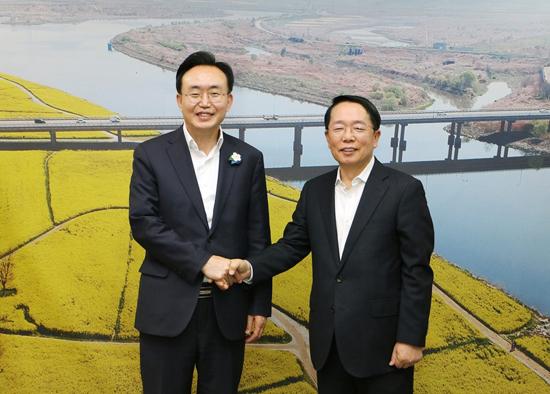 윤병태 전남 나주시장(왼쪽)과 김경호 (재)남도장터 대표이사가 법인 나주 이전을 계기로 상호 협력 강화를 다짐하고 있다. /나주시 제공