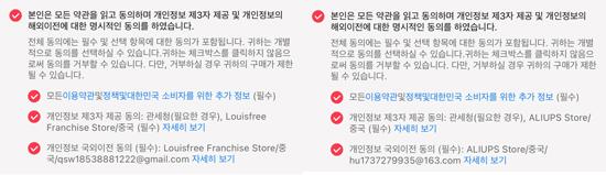 해당 항목에 동의할 경우 \'Cathay Insurance Company\', \'ZhongAn Online P&C Insurance\' 등 알리익스프레스의 중국 소재 개인정보 국외 위탁 회사를 비롯해 중국 판매자에게까지 개인정보를 제공하게 된다.