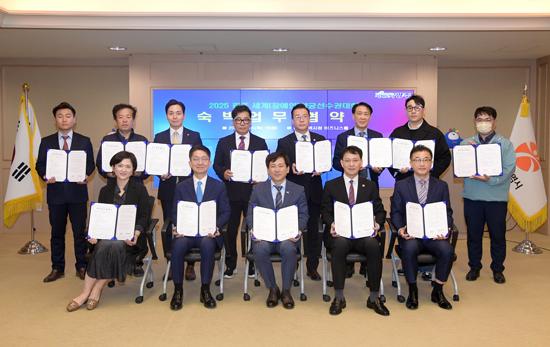 이상갑 광주광역시 문화경제부시장이 16일 오후 시청 비즈니스룸에서 열린 ‘2025광주세계(장애인)양궁선수권대회’ 숙박 업무협약식에 참석해 숙박업소 대표와 협약을 체결한 후 기념촬영을 하고 있다. /광주시 제공