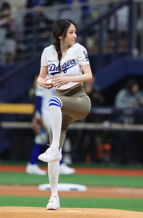 배우 전종서가 17일 서울 고척스카이돔에서 열린 로스앤젤레스(LA) 다저스와 키움 히어로즈의 미국프로야구(MLB) 서울시리즈 연습경기에 앞서 시구를 하고 있다. (공동취재)