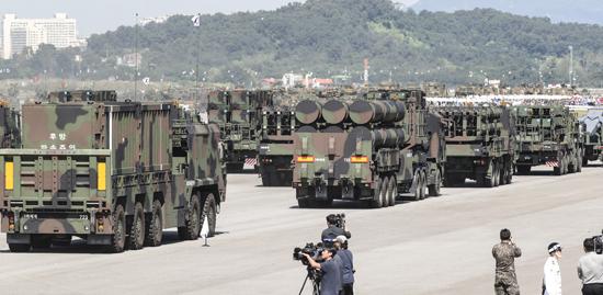 지난해 9월22일 오전 경기 성남 서울공항에서 열린 건군 75주년 국군의 날 미디어데이에서 국군 장병들이 3축체계의 핵심인 해성,타우러스,천궁(L-SAM) 등을 기동하고 있다. 2023.09.26.