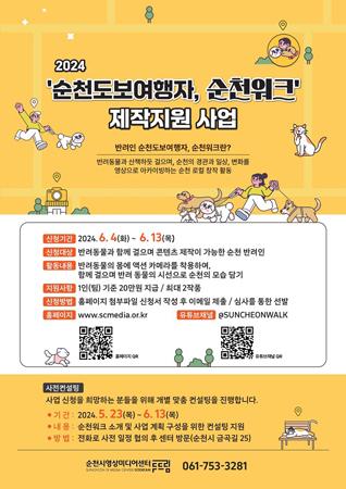 순천시영상미디어센터(이하‘센터’)는 \'2024 순천도보여행자, 순천워크 제작지원 사업\'의 참여자를 6월 13일까지 모집한다고 밝혔다.