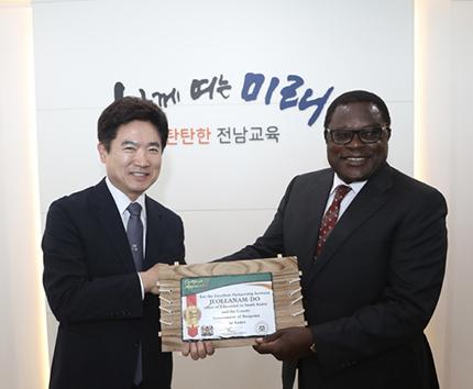 케냐 붕고마 카운티 루사카 케네스 마켈로 주지사와 붕고마주 니콜라스 제이티 키보이 교육청장은 이날 도교육청을 방문, 학생용 재활용 책걸상을 지원해준 대한 고마움을 담은 감사패를 김대중 교육감에게 전달했다.