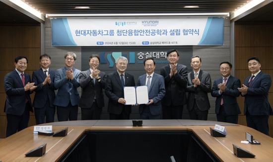 현대차그룹과 숭실대는 지난 12일 숭실대 베어드홀(서울시 동작구 소재)에서 김걸 현대차그룹 사장, 장범식 숭실대 총장 등이 참석한 가운데 재직자 재교육형 계약학과 『현대차그룹 첨단융합안전공학과(석사과정)』 설립을 위한 협약식을 개최했다고 13일 밝혔다.