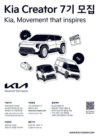 지원 신청은 6월 14일부터 7월 1일까지 기아 크리에이터 홈페이지(http://www.kia-creator.com)를 통해 진행되며 서류 전형과 면접을 거쳐 최종 합격자를 선발할 계획이다.