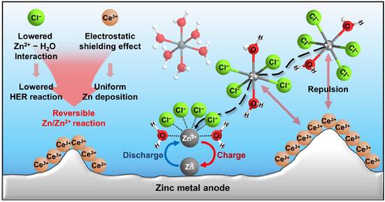 연구팀은 염화세륨(CeCl3)에서 세륨 양이온(Ce3+)과 염소 음이온(Cl-)이 동시에 작용하는 전해질 첨가제를 활용해 아연금속 음극의 불안정성을 해결했다.