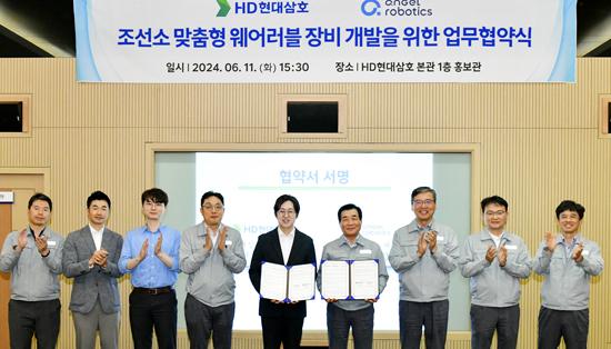 17일 HD현대삼호에 따르면 최근 HD현대삼호 본관에서 신현대 사장과 엔젤로보틱스 공경철 대표를 비롯한 주요 관계자가 참석한 가운데 ‘조선소 맞춤형 웨어러블 장비 개발’을 위한 업무협약‘을 체결했다.