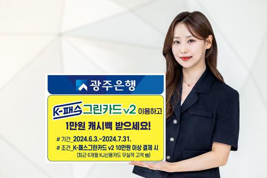 광주은행은 최근 6개월 내 KJ신용카드 무실적 고객을 대상으로 \'K-패스그린카드v2\' 1만원 캐시백 이벤트를 내달 31일까지 진행한다고 17일 밝혔다.