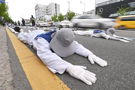 발달장애인 자녀를 둔 학부모들과 지역 장애인단체 관계자들이 17일 오전 광주 서구 화정동 상무대로에서 정부를 향해 발달장애인 가정·생명 보호정책 지원체계 구축을 촉구하며 오체투지를 진행하고 있다. 2024.06.17.