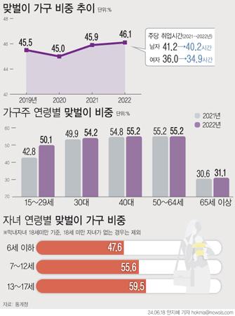 맞벌이 가구 비중은 2020년 45.0%, 2021년 45.9%, 2022년 46.1%, 지난해 48.2%로 매해 꾸준한 증가세를 보이고 있다.
