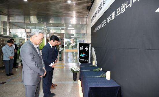 분향소는 26일 오후 구청 1층 현관 입구에 설치했다. 시민, 노동자, 구청사 방문 민원인 등 누구나 희생자를 추모하고, 마음을 전할 수 있다.