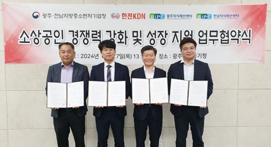 중소벤처기업부 광주전남지방중소벤처기업청은 27일, 한전KDN, 전남테크노파크, 전남지식재산센터, 한국발명진흥회광주지부 광주지식재산센터와 지식재산권이 강한 소상공인 육성 등을 위한 업무협약을 체결했다고 밝혔다. /광주전남중기청 제공