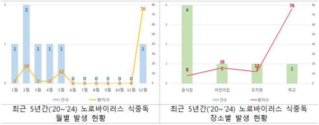 장소별로는 음식점에서 발생한 건수가 4건(환자 8명)으로 가장 많았으나, 전체환자의 93%는 어린이집·유치원·학교 등 집단급식소에서 동시 발생했다.
