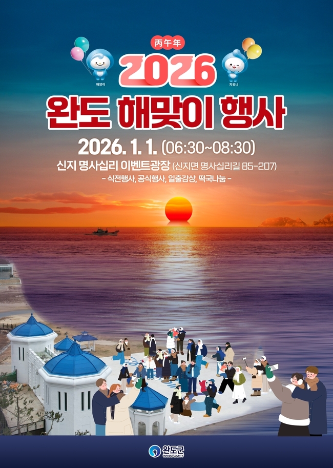 완도군은 내년 1월 1일 오전 6시 30분부터 8시 30분까지 신지 명사십리 이벤트 광장에서 ‘병오년(丙午年) 해맞이 행사’를 개최한다.