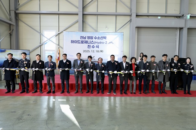 영암군이 지난 18일 대불산단에서 국내 최초 한국해양교통안전공단(KOMSA) 인증 수소연료전지 추진 선박 ‘하이드로제니스(Hydro-Zenith)’를 진수했다.