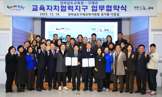 구례군은 지난 19일 구례교육지원청 섬지뜰 다담실에서 전라남도교육청, 구례교육지원청, 구례군의회, 학교장, 민관산학위원, 학부모연합회 등 50여명이 참석한 가운데 ‘구례교육자치협력지구’업무협약을 체결하였다고 밝혔다.