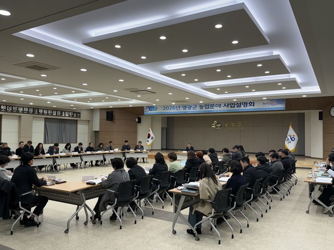 영광군에 따르면 이날 읍면, 농·축협 및 농업관련단체 등 60여 명이 참석했으며, 2026년 농업분야 사업의 추진방향과 신규·변경사항 설명 및 필요한 사업을 기한 내 신청하도록 안내했다.