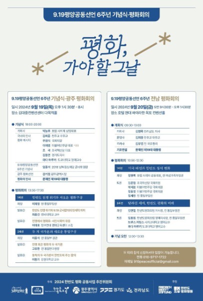 오후 6시에는 ‘9·19평양공동선언 6주년 기념식’이 열린다. 박능후 포럼 사의재 상임대표(전 보건복지부장관)의 개회사를 시작으로 김희중 전 대주교의 환영사, 조국 조국혁신당 대표‧김동연 경기지사의 평화메시지 발표가 이어지고, 이재명 더불어민주당 대표는 영상 메시지로 참석할 예정이다.