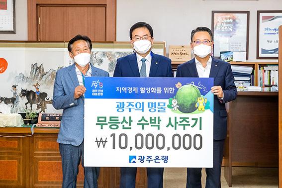 광주은행은 지난 17일 광주 북구청에서 송종욱 은행장과 문인 북구청장 등이 참석한 가운데 ‘무등산 수박 살리기 운동’ 구매 행사를 가졌다.