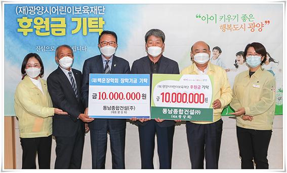 동남종합건설(주) 왕상희 대표는 지난 27일 시청 소회의실에서 정현복 광양시장, 황재우 보육재단 이사장 등 10여 명이 참석한 가운데, 어린이보육재단과 백운장학회에 각각 1000만원씩 기탁했다.