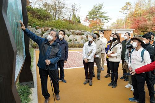 문재인 대통령이 31일 오전 북악산 성곽 북측면을 52년 만에 일반인에게 개방에 앞서 최종점검을 위한 산행 중 청운대안내소에서 북악산 등산로가 그려진 안내판을 보며 이야기를 하고 있다. 1968년‘1·21사태’이후52년간 일반인의 출입이 제한되었던 청와대 뒤편 북악산 북측면은 11월1일부터 일반 시민에게 개방된다.
