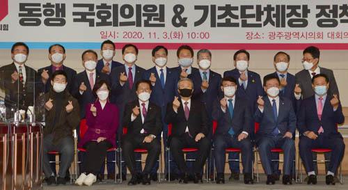 김종인 국민의힘 비상대책위원장과 호남동행 국회의원들이 3일 오전 광주 서구 광주시의회 대회의실에서 광주 5개 구청장 정책협의회에 앞서 기념촬영을 하고 있다.