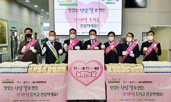 농협전남지역본부는 농업인의 날을 맞은 11일 전남도, 전남도교육청과 함께 전남 쌀로 만든 가래떡을 나누는 행사를 개최했다.