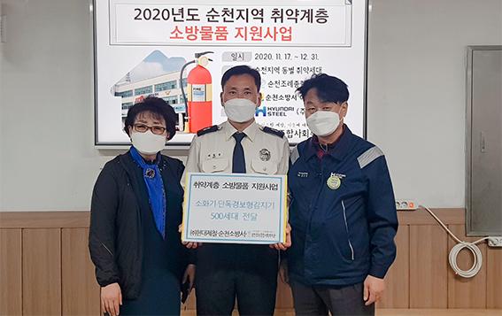 이날 현대제철 순천공장은 소화기 3.3kg 500대와 단독경보형 감지기 500개를 후원하였으며 독거노인 등 화재안전 사각지대에 있는 취약계층에 순차적으로 무상 보급·설치할 예정이다.