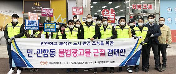 광산구가 20일 공무원, 광산구시설관리공단 직원, 옥외광고협회 회원 등 40여 명이 참가한 가운데 수완동 국민은행 일대에서 불법광고물 근절 민·관 합동캠페인을 진행했다.