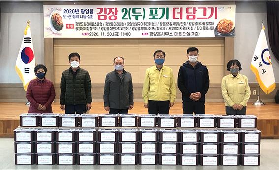 ‘김장 2(두)포기 더 담그기’ 나눔은 후원자들이 김장할 때 김장 2(두)포기를 더 담가 전달하는 방법으로 이번 행사에 참여하는 사회단체는 광양읍 지역사회보장협의체, 주민자치위원회, 이장협의회, 광양읍5일시장상인회, 광양로터리클럽, 광양숯불구이추진위원회, 한마음봉사회, 광양드림라이온스클럽, 광양읍내자율방범대, 서부여성자원봉사회, 광양매일시장 등 총 11곳이다.
