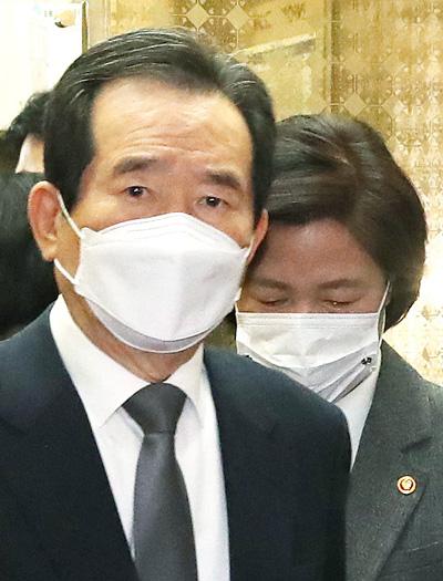 정세균 국무총리와 추미애 법무부 장관이 1일 오전 서울 종로구 정부서울청사에서 독대를 마친 후 국무회의으로 이동하고 있다.