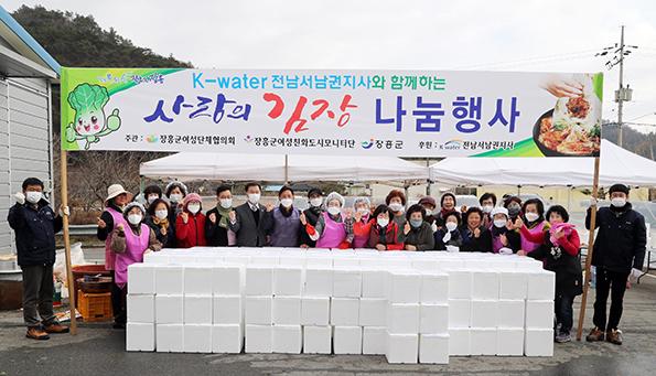 장흥군(군수 정종순), K-water 전남서남권지사(지사장 정찬), 장흥군여성친화도시 모니터단(단장 마점숙)은 지난 2일 유치시장에서 김장 나눔 행사를 가졌다.