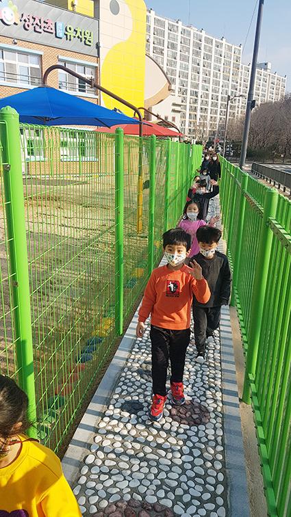 성진초병설유치원이 유아 및 교사의 기초체력 향상 및 스트레스 해소 등 조화로운 심신 발달 도모를 위해 유치원 바깥 놀이터에 ‘건강 지압길’을 조성했다고 8일 밝혔다.