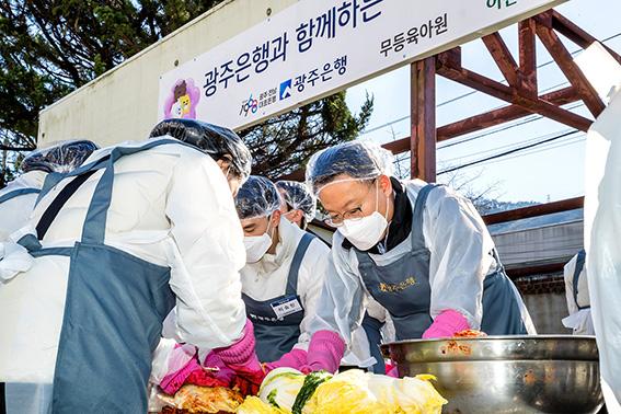 광주은행은 9일 광주시 동구 운림동 무등육아원에서 송종욱 은행장과 신입행원 30여명이 참여한 가운데 사랑의 김장나눔 봉사활동을 펼쳤다.