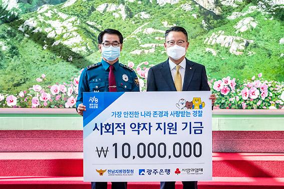 광주은행은 17일 범죄 피해로 고통을 겪고 있는 피해자들을 돕기 위해 지원기금 1000만원을 전남지방경찰청에 전달했다고 밝혔다.