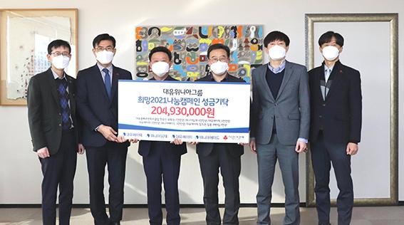 대유위니아그룹은 대유몽베르컨트리클럽 한유진 부회장의 사재 7000만원 기부를 시작으로 계열사인 위니아딤채 4000만원, 대유에이텍·대유에이피·위니아에이드 각 3000만원에 대유에이텍 임직원들이 모금한 493만원을 더해 기부금을 기탁했다.