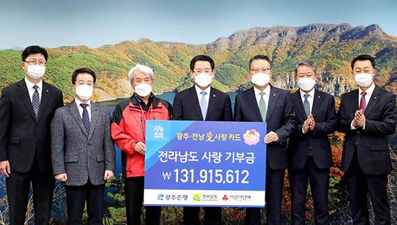 전남도가 도내 취약계층에게 지원할 광주은행의 '광주·전남애(愛) 사랑카드' 성금 1억3000만원을 기탁 받았다.