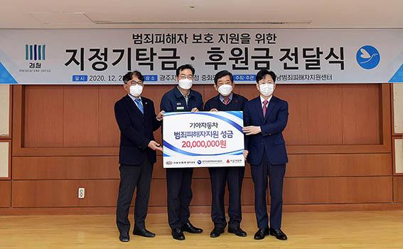 기아차 광주공장은 22일 오전 광주지방검찰청에서 열린 ㈔광주전남범죄피해자지원센터 송년 행사에서 범죄피해자들의 아픔을 치유하는데 쓰일 후원금 2000만원을 기탁했다.