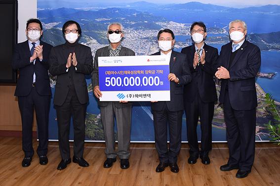 여수국가산단 내 ㈜와이엔텍(회장 박용하)이 지역 인재양성을 위해 쓸 장학금 5억 원과 불우이웃 돕기 성금 5000만 원을 28일 여수시에 쾌척했다.