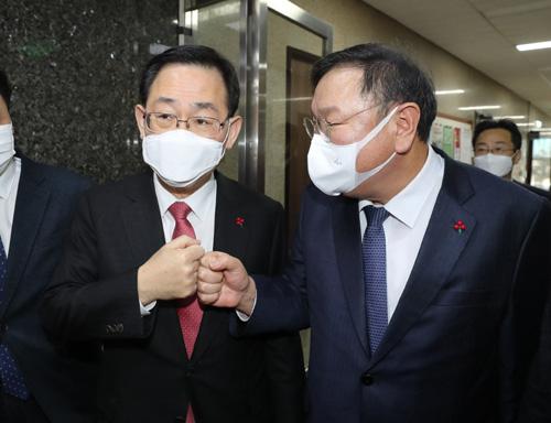 김태년 더불어민주당 원내대표가 주호영 국민의힘 원내대표와 5일 오전 서울 여의도 국회에서 본회의 개최 논의를 마치고 주먹인사를 하고 있다.