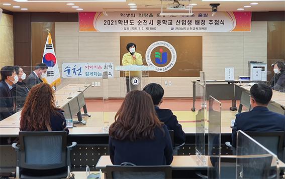 순천교육지원청은 교육청 대회의실에서 학생, 학부모를 비롯한 순천관내 교육가족이 참석한 가운데, ‘2021학년도 순천시 중학교 신입생 배정 추첨식’을 개최했다.