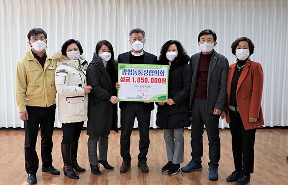 김재호 광영동 통장협의회장은 “코로나19로 힘든 시기에 어려운 이웃들에게 보탬이 되고자 회원들이 뜻을 모아 성금을 마련했다”며, “적은 금액이지만 복지사각지대에 있는 이웃들에게 조금이나마 도움이 됐으면 한다”고 전했다.