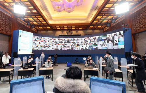 온·오프라인 방식 병행은 신종 코로나바이러스 감염증(코로나19) 방역 지침 준수에 따른 처음 시도되는 방식이다. 영빈관이 아닌 춘추관에서의 신년 회견도 이번이 처음이다.